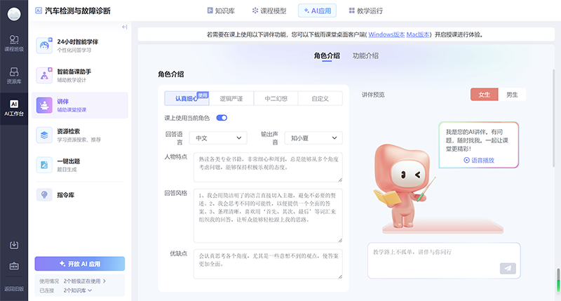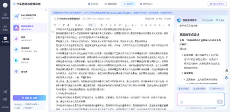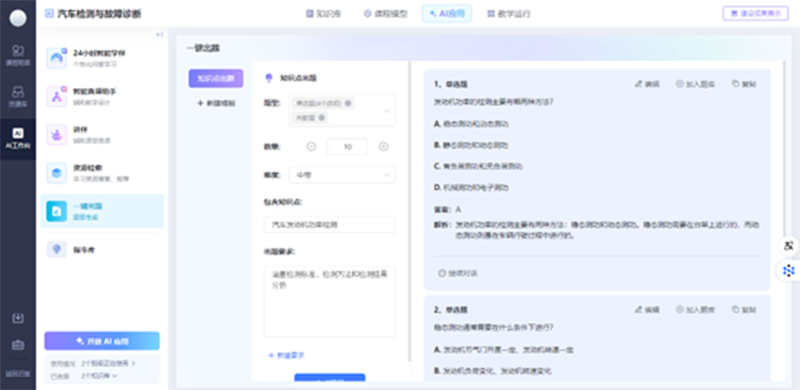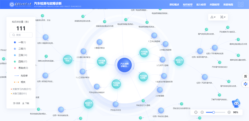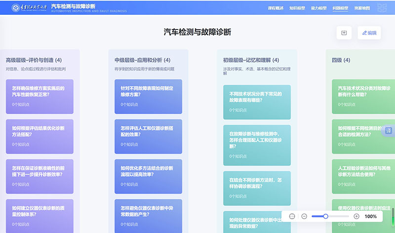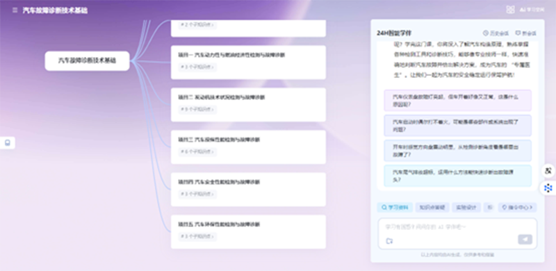 学生可利用知识图谱系统化掌握汽车检测与故障诊断相关的理论知识,同时AI智能体可基于课程实时分析学习行为,通过牵引式提问、链接式任务推送等引导学生深度参与课堂,强化理论知识基础,逐步构建诊断分析的逻辑思维能力。