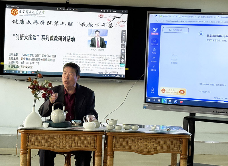 为积极响应学校“AI+教学模式改革”的号召,健康文旅学院正式启动了“创新大家谈”系列教改研讨活动。该系列活动旨在通过深入探讨和实践,全面促进学院的高质量教学,推动“AI+教学行动化”改革的深入实施。4月16日下午1:30,首次研讨活动在茶艺实训室如期举行。本次活动的主题为“AI+教学行动化”的价值与途径,吸引了众多师生的积极参与。活动由职业教育研究院院长单凤儒教授担任嘉宾主持,他以深厚的学术背景和丰富的实践经验,为与会者带来了深刻的见解和启发。