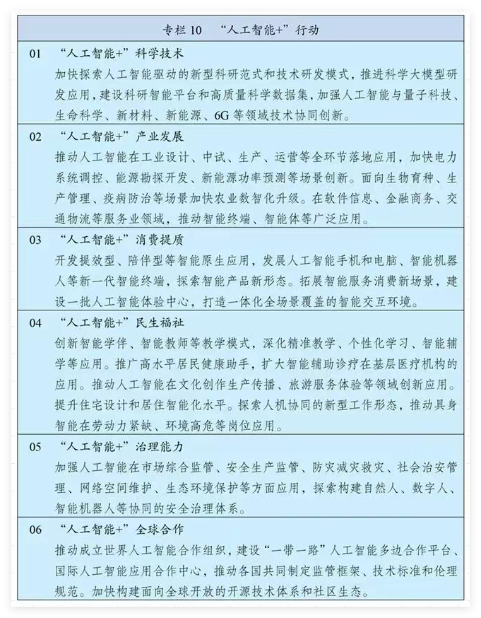 全面实施“人工智能+”行动,加强人工智能同科技创新、产业发展、文化建设、民生保障、社会治理相结合,抢占人工智能产业应用制高点,全方位赋能千行百业。