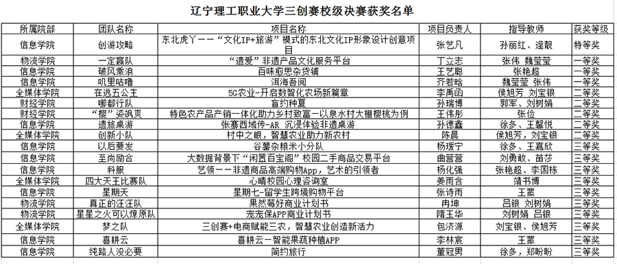 同学们充分展示项目特色及团队创新创意风采,评委们结合创新、创意、创业、演讲及文案五个方面进行现场打分,并给予充分指导意见。本次比赛获获奖情况如下: