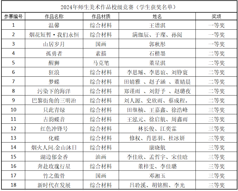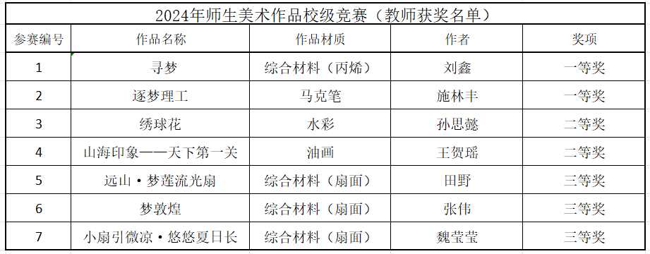本次竞赛设学生组和教师组,共收录40余件作品,邀请评审专家评审,最终评出教师组一等奖2人、二等奖2人、三等奖3人:学生组一等奖3人,二等奖6人,三等奖9人,上述作品推送参加2024年辽宁省高校师生美术作品大赛。校赛获奖作品如下: