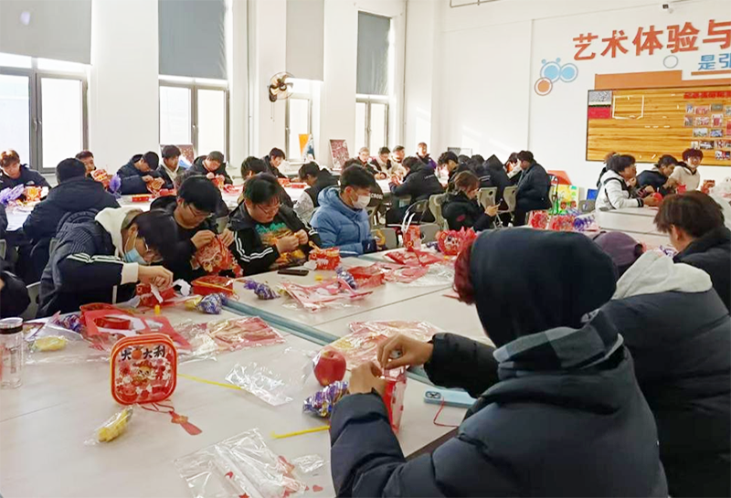 联欢会现场,五彩斑斓的材料摆放整齐,各式各样的做灯笼的工具一应俱全,刘老师向同学们普及了灯笼的来历以及寓意、介绍灯笼的制作方法,然后同学们自己选材,制作灯笼。同学们兴奋极了,有的专注于蛇身上的色彩搭配;有的精心挑选装饰材料,将寓意吉祥的中国结、铃铛等巧妙地悬挂在灯笼上,使其在摇曳间发出清脆悦耳的声响,为灯笼增添了几分灵动之美。制作场景热闹非凡,充满了欢声笑语,师生互相帮助,彼此鼓励、分享经验,教室里弥漫着温暖与和谐的气息。
