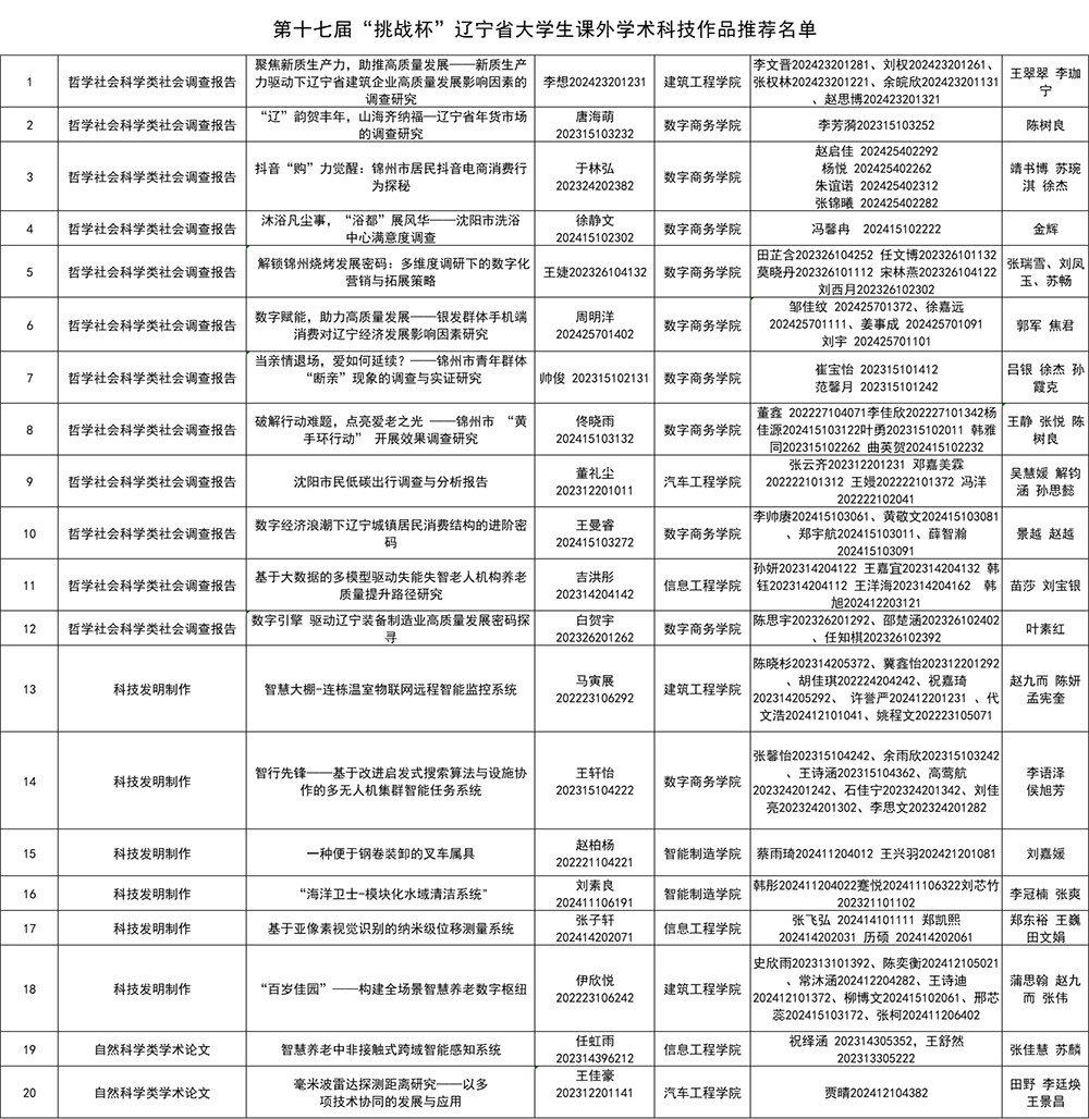 4月10日-25日,beat365顺利举行第十九届“挑战杯”辽宁省课外学术科技作品竞赛校级选拔赛。本次“挑战杯”大学生创业计划竞赛校赛自启动以来,得到各二级学院的大力支持和广大师生的广泛关注,初赛报送作品85件。经有丰富经验的专家线上评审,最终拟定20项作品推荐入围,现将名单公示如下: