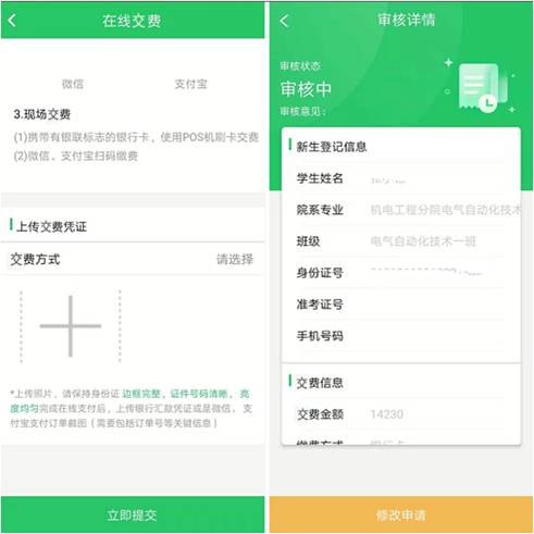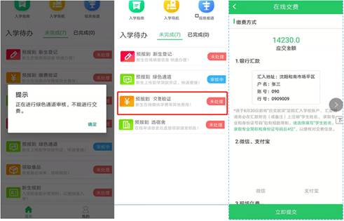 如果申请了绿色通道就要等到教师审核结束才能进行在线交费,绿色通道审核通过后应交金额会自动调整,如果不需要申请绿色通道的同学可以直接点击“预报到交费验证” —>选择交费方式并上传凭证后点击“提交”