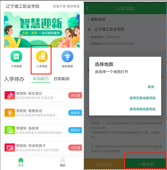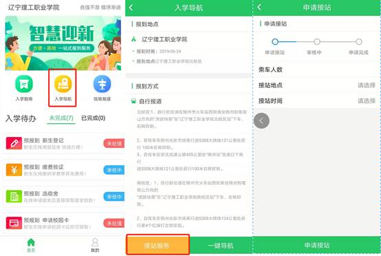 登录智慧迎新APP —> 点击“入学导航” —>可以选择一键导航或接站服务。
