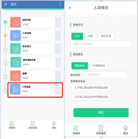 进入入学报到界面,学生录入入学报到时间、方式、是否接站等信息,点击提交按钮。