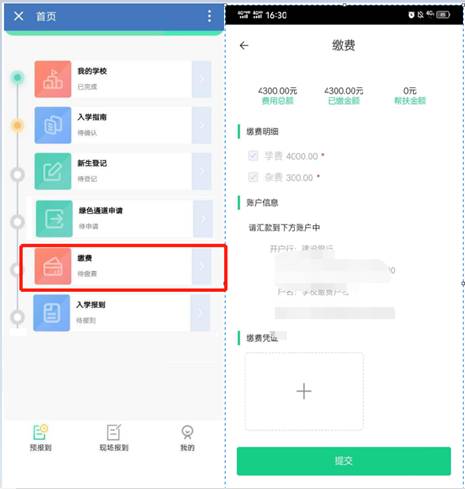 如果申请了绿色通道就要等到教师审核结束才能查看缴费信息,绿色通道审核通过后应缴金额会自动调整,如果不需要申请绿色通道的同学可以直接点击“缴费”查看交费明细。