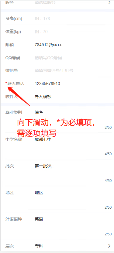 3、进入线上报到环节,向下滑动逐项填写,*号为必填。