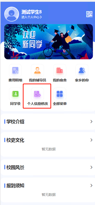 8、完成线上报到后会自动进入到系统。后期可以点击个信息修改进行线上报到信息的调整。