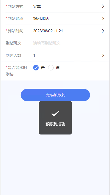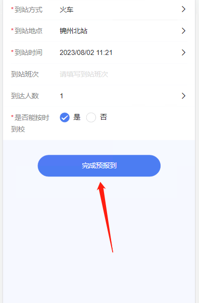 7、填写到站信息后点击“完成预报到”按钮,完成线上报到。