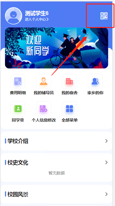 新生进入迎新系统移动端,出示右上角的二维码,进行现场报到。