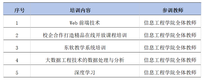 为不断提升教师实践能力培养,聘请企业资深工程师到到学校开展培训讲座,累计参培人数共计百余人次,并利用寒暑假期时间开展Web前端开发方向和大数据方向“双师型”教师赋能培训。