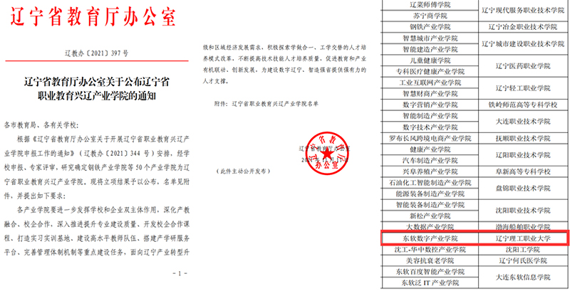 2021年11月东软数字产业学院获批辽宁省首批职业教育“兴辽产业学院”