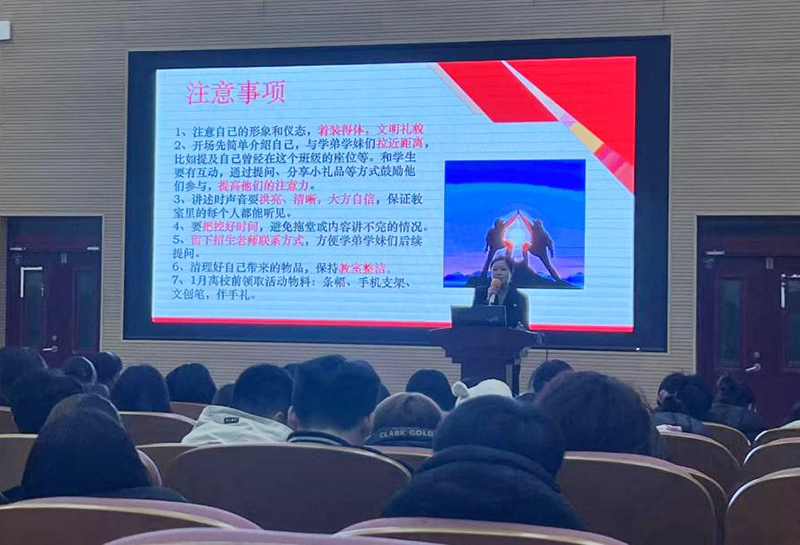 会上,杨洋副处长阐述了本次活动的重要意义。她指出,“薪火相传·感恩母校行”不仅是一次分享与回馈的机会,更是连接母校与大学的情感纽带。她鼓励同学们以亲身经历,向高中母校的学弟学妹生动讲述自身成长过程,助力学弟学妹在未来职业选择中明确学习目标,坚定奋斗方向。