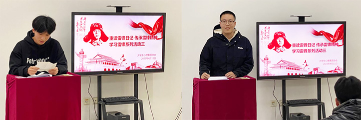 活动伊始,心理协会干部带领同学们观看了全国优秀教师聂红老师讲述“雷锋钉子精神永放光芒”的视频。接着是重读雷锋日记,“今天由我为您朗读雷锋日记,让我们一起重温雷锋同志那感人至深的暖暖情愫、桩桩善举。”同学门纷纷上台,声情并茂的朗读雷锋日记,雷锋精神滋养着每个同学的心灵,大家从中汲取榜样力量。
