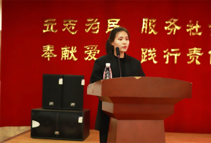 学生代表王思淇在发言中,用真诚的话语表达了对学院领导、老师们精心教育培养的感谢:被无私、热情的关怀和培养而感到无比幸运与自豪,正是老师的谆谆教诲与默默付出让她快速成长。她代表新一届学生会干部表示:要时刻以优秀团员、优秀学生干部的标准严格要求自己,提升学生干部队伍的素质和能力,带领同学们努力将“自强不息、守正创新”的理工校训精神发扬光大。