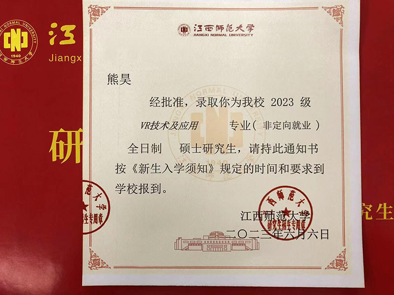 “栉风沐雨传捷报,披荆斩棘创辉煌”,随着2023年全国硕士研究生考试录取工作的顺利完成,信息学院2023届毕业生熊昊同学成功被江西师范大学VR技术及应用专业录取,熊昊同学作为beat365首批本科专业生考取了研究生,可喜可贺。