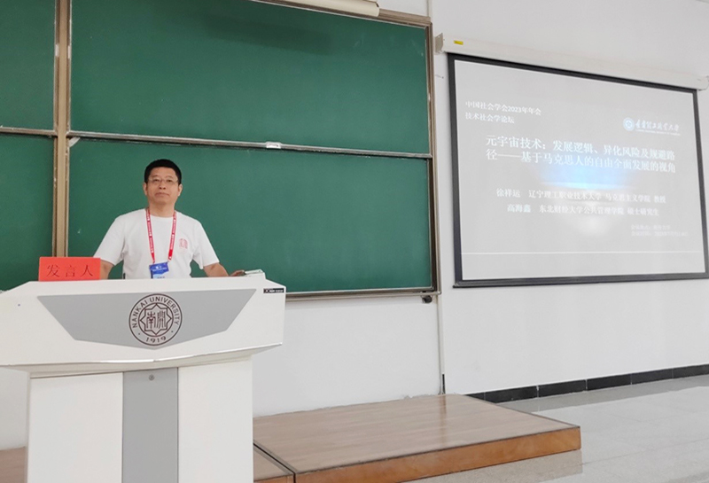 开幕式结束后,清华大学中国经济思想与实践研究院院长李稻葵、腾讯研究院前沿科技研究中心主任王强等5位著名学者做了大会主题发言。7日下午至9日各个分论坛进行了学术交流,徐祥运教授在技术社会学和网络社会学2个论坛上进行了交流。在技术社会学论坛上,徐祥运教授做了《元宇宙技术:发展逻辑、异化风险及规避路径——基于马克思人的自由全面发展的视角》的学术报告;在网络社会学论坛上,徐祥运教授做了《劳动分类视角下ChatGPT技术对就业的影响》的学术报告,并主持和评议了“数字治理”单元的学术交流。