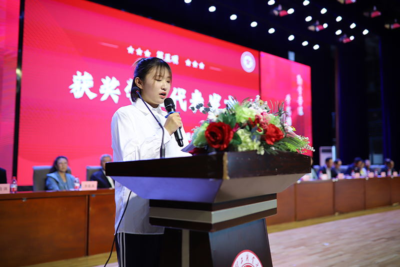 获奖学生代表2022级机电学院何恩晴同学发言,她表示一年的大学生活,有两点深刻的体会:一是在学习中完善自己,二是在实践中磨砺自己,并激励学弟学妹们与师长为友、与知识为伴,为梦想而努力。