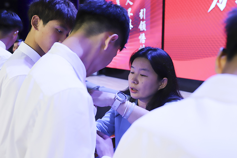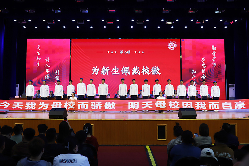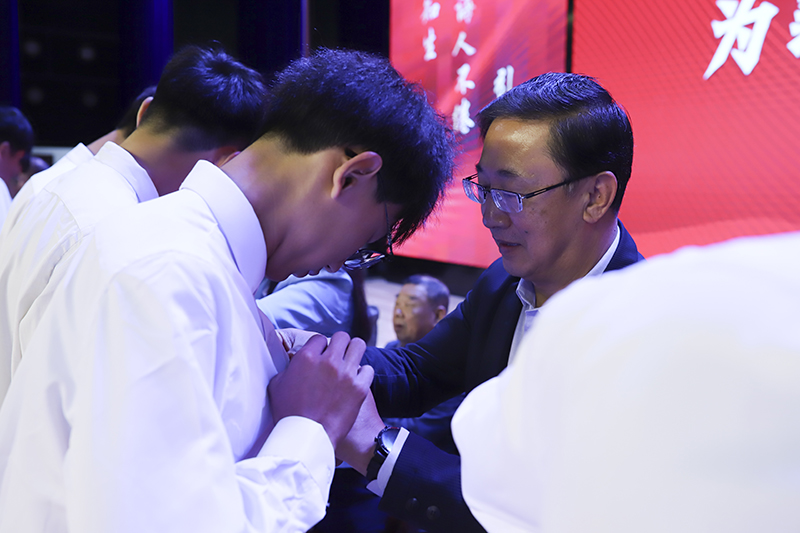 学校领导为新生代表佩戴校徽。戴上校徽的那一刻起,新同学们真正成为了“理工人”,既是荣耀加冕,亦是重任在肩。校徽中承载着beat365在线唯一官网“自强不息,守正创新”的校训精神,理工学子们将心怀家国,不忘初心,踔厉奋发、砥砺前行。