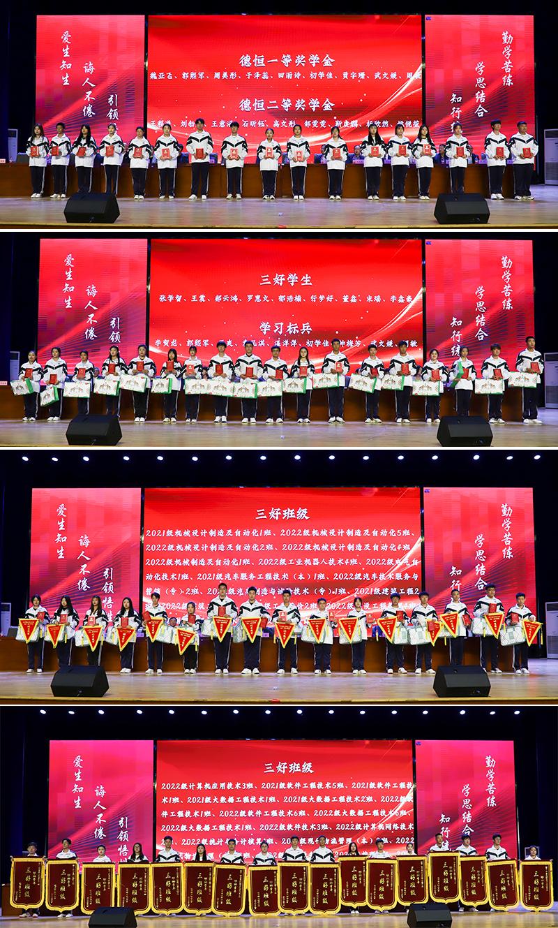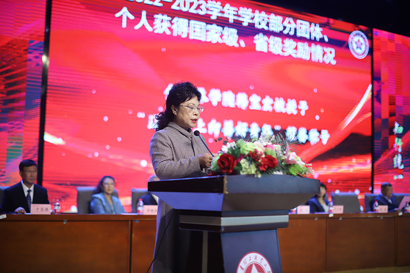 蔡红武副书记宣读了2022-2023学年学校部分团体、个人获得国家级、省级奖励名单;2023年国家级、省级技能大赛获奖名单;2023年国家级、省级创新创业大赛获奖名单。