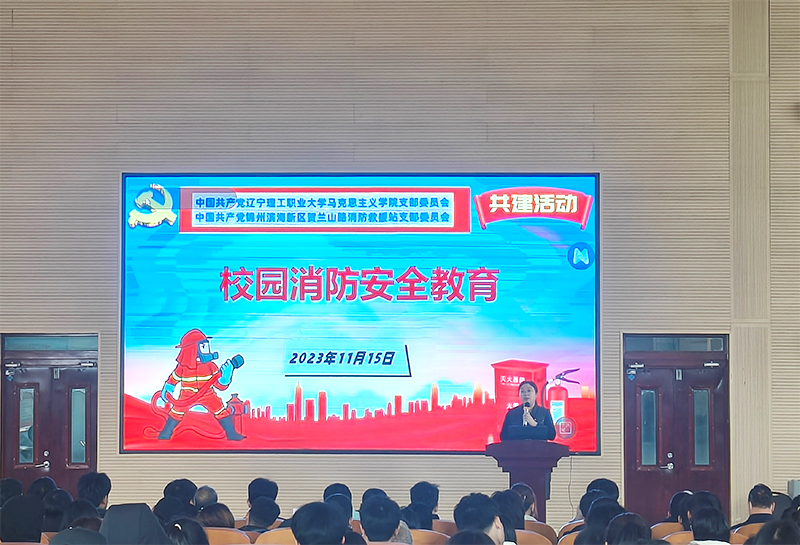 为推动党建工作深入开展,进一步营造党建工作互建互学的良好氛围,积极创建安全、稳定、和谐的校园环境,2023年11月15日13时30分,马克思主义学院采取“请进来”方式,邀请锦州滨海新区贺兰山路消防救援站副站长傅天放为师生做校园消防安全教育讲座,马克思主义学院院长张觉力以及全体思政课教师、马克思主义学院教师指导的8个综合社团200余名学生代表参加了报告会。报告会在北校区主楼1楼报告厅隆重举行,马克思主义学院党支部书记王玉娥主持。