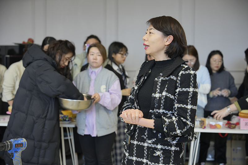 在活动开始前,校工会主席陈卓向女教职工送上节日祝福,并介绍比赛规则,妇委会主任叶素红为参赛女教职工加油鼓劲。接着,烘焙老师讲解制作步骤、烘焙技巧和注意事项,在准备工作就绪后,参赛小组开始制作,烘焙老师帮助大家打发奶油,各组选手集思广益,对照图案涂抹奶油装饰花型。为了和比赛图案契合度更高一些,大家互相商量,反复修整,发挥各自专长,有人擅长涂平奶油,有人擅长制作花型,还有人擅长制作水果拼样,各组间有竞争,但更多是相互借鉴,虽然多数都是烘焙新手,大家你一言我一语,即使成品不如意,脸上洋溢的笑容也丝毫未减,为共同创作的作品感到自豪。