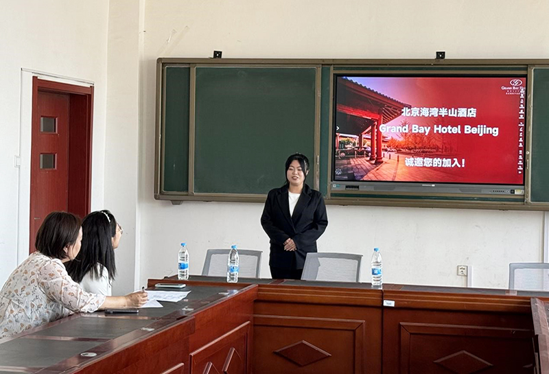 北京半山海湾大酒店人力资源部经理胡明星给学生们介绍了海湾酒店的概况,从珠海到北京,再到成都,经过二十余年的积淀和创新,海湾大酒店已成为行业知名的五星级酒店。胡经理又介绍了北京半山海湾酒店的发展历程,力求给学生们一个没有天花板的舞台。