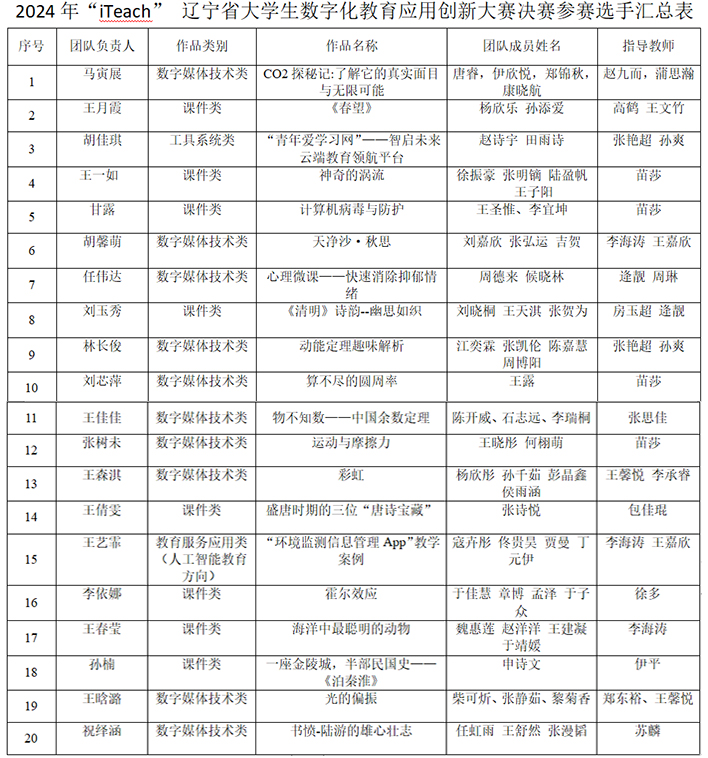 本次竞赛共有5个教学单位参加,共提交作品50个。经专家评委线上评审,最终评选出20个优秀作品代表beat365参加2024年第四届辽宁省大学生“iTeach”数字化教育应用创新大赛省级竞赛,名单如下: