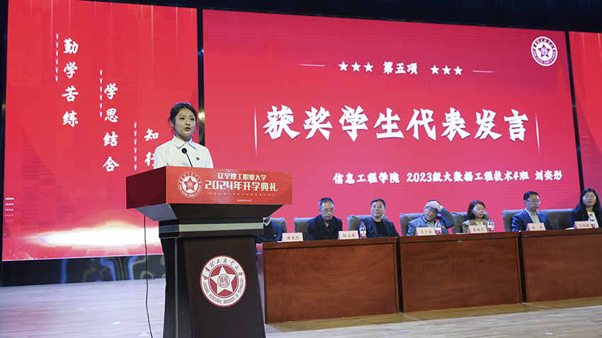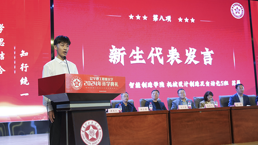 新生代表智能制造学院机械设计制造及自动化专业6班苏展代表全体新生发言,他倡议新生要志存高远,做德才兼备的理工职大人,笃学力行,做不懈奋斗的理工职大人,挺膺担当,做爱校荣校的理工职大人。秉承校训,书写大学生活的辉煌篇章。