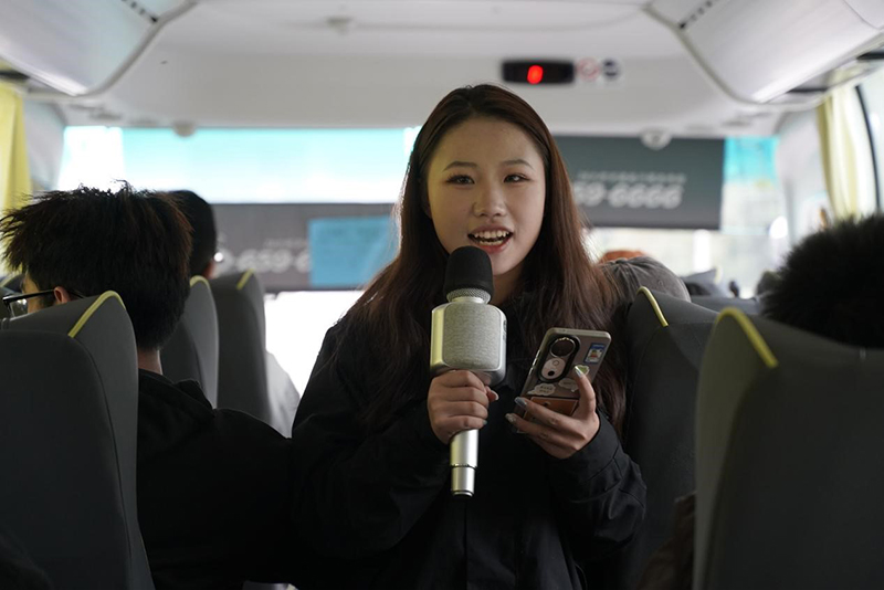 在前往北普陀山的路上,来自贵州苗族的2023级旅游专业同学龙锦梅在途中担任本次活动导游,她绘声绘色地为同学们介绍这座充满魅力的英雄城市锦州;介绍了享有“关外第一佛山”美誉的北普陀山;随后,彝族同学沙马英汉用彝语唱起了歌曲《阿嫫》,《卓玛》的响起更是点燃了整个车上的氛围,各民族同学纷纷拍手合唱,共同感受着各民族文化交融的美好。