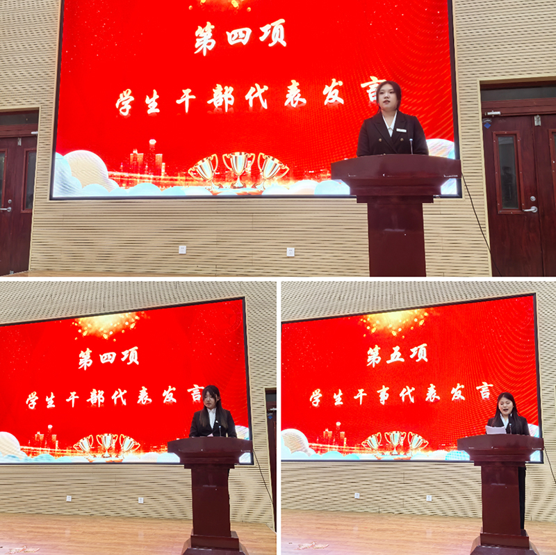 学生会主席付钰婷、综合事务部部长何陈博馨与干事代表周浔分别发言,表达了对学生工作的热情与决心。他们表示将以服务同学为宗旨,以提升自我为目标,积极投身于校园活动与学生事务管理中,为打造更加和谐、积极、向上的校园环境而努力。