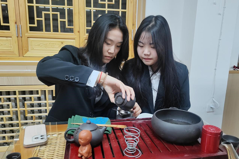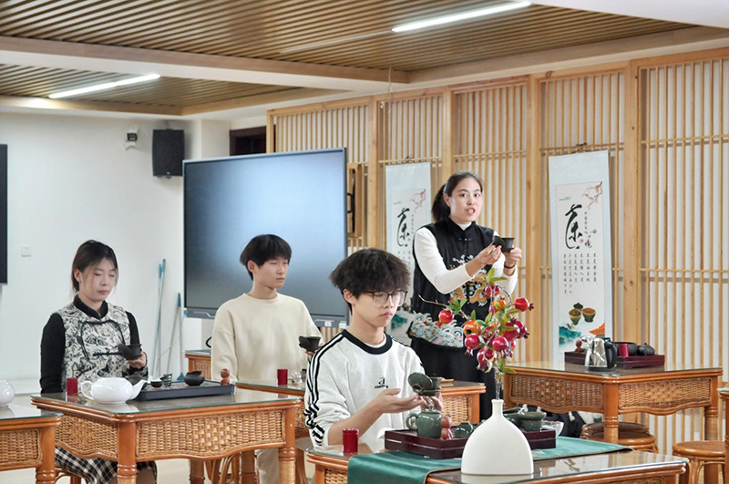 实践体验环节,同学们兴奋不已,大家小心翼翼地拿起茶具,运用于老师讲授的方法,辨别水温,仔细斟酌茶叶用量。尽管起初动作尚显生疏笨拙,但那专注的眼神和认真的态度令人为之动容。唐海萌同学们深有感触地说,“原本以为沏茶就是简单地把茶叶放进水里,没想到竟有如此多的门道和讲究,于老师的讲解不仅让我们掌握了茶艺技巧,更激发了他们对传统茶文化的热爱。”