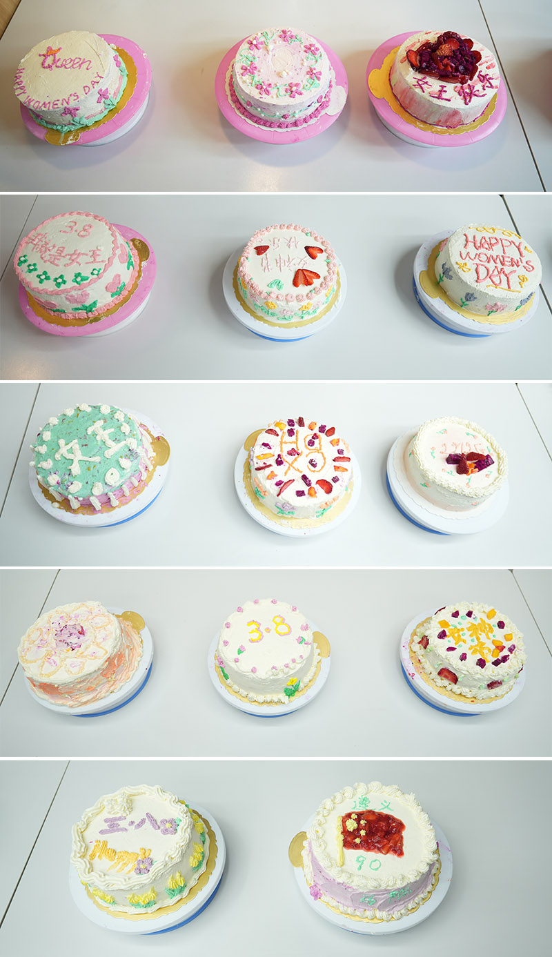 经过一个多小时的努力,一个个形态各异、甜蜜诱人、令人欢喜的奶油蛋糕呈现在大家眼前,有的蛋糕装饰着奶油花朵,有的蛋糕写满节目祝福语、有的点缀着水果,每一个蛋糕都凝聚着女教职工们的智慧与创意,大家纷纷拿起手机,与作品合影留念,记录这美好时刻。最后,各分工会选派一人担任评委,现场评比打分,决出一、二、三等奖。