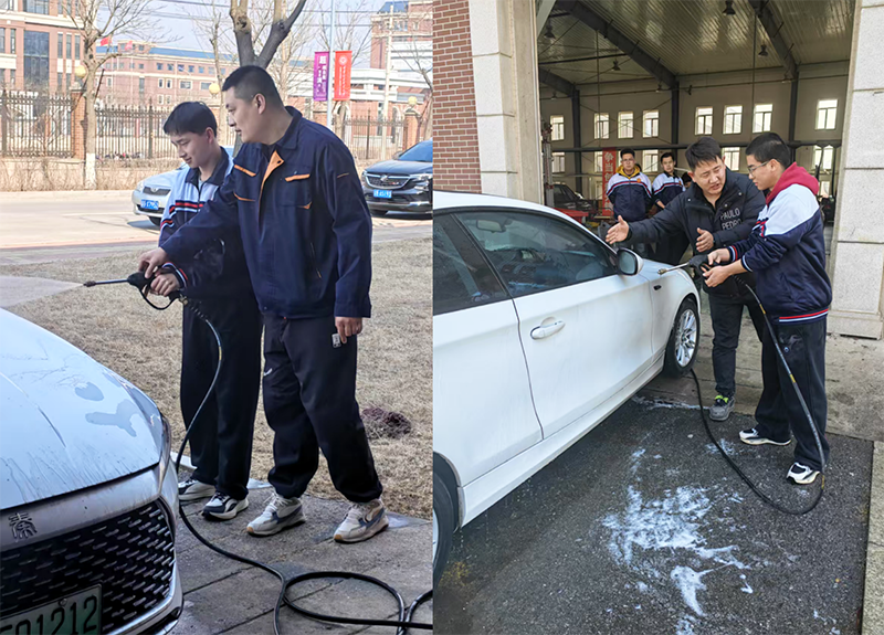 活动现场,同学们热情高涨,积极参与到汽车清洁与美容工作中。“大黄蜂”服务的教师在同学们的实践过程中,对学生进行耐心指导。生力强手把手为学生讲解高压水平冲洗的角度和曲线。杜双老师传授学生汽车美容过程中需要注意的要点。