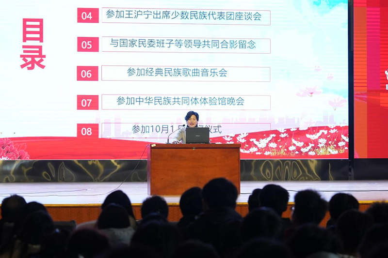 活动特别邀请到全国民族团结进步模范个人、全国三八红旗手、辽宁省劳动模范、辽宁道光廿五集团董事长张慧走进校园,与学生们进行面对面的交流互动。张慧以《铸牢中华民族共同体意识》为主题,将企业家精神与民族共同体理念紧密结合,从责任、担当、团结三个维度展开分享。她讲述了参加全国民族团结进步表彰系列活动以及庆祝中华人民共和国成立75周年系列活动的深刻感悟,把现场聆听习近平总书记重要讲话的珍贵体会传递给现场的师生们,激励同学们牢记自己“中国人”身份,勇担“新时代”使命。