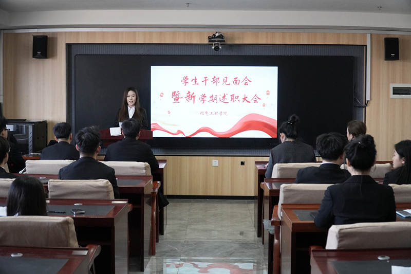 为全面总结学生工作成果,加强干部队伍建设,提升学生组织效能,信息工程学院于3月12日在行政楼908会议室召开2024—2025学年第一学期学生干部述职大会。学院主管学生副院长黎婧、团总支书记关妍、学生干部代表共50人参加本次会议,会议由办公室主任杨小婷主持。