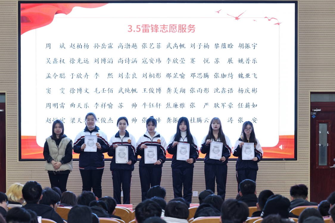 张丹、杨丹妮为参加学院学雷锋系列愿活动的96位同学颁发志愿服务时长认定证书。志愿者们用切身行动传承雷锋精神,为社会无私奉献自己的青春力量。