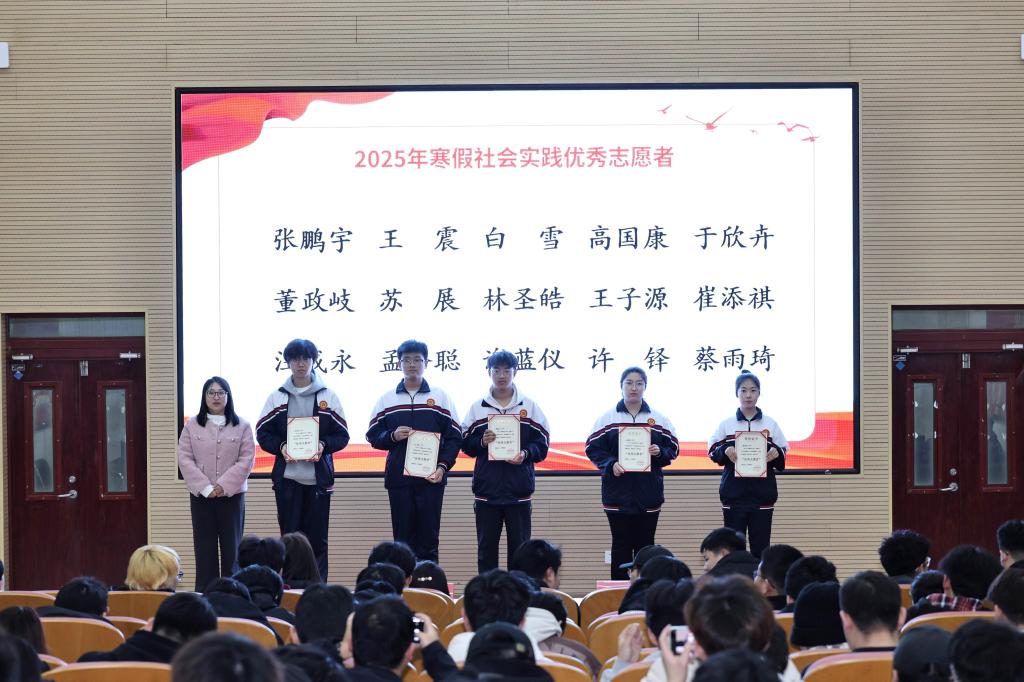 参加寒假社会实践学生代表苏展、许铎等15位同学依次进行发言,每名同学都分享了自己在实践中的所见、所闻以及从这次实践中满满的收获,言语之间勾勒出他们从青涩到成熟的蜕变轨迹,学生代表呼吁同学们积极参加社会实践活动来丰富自己的课余生活。
