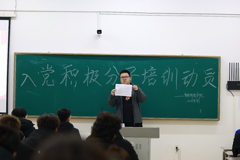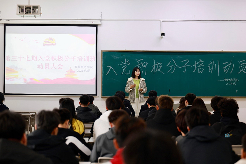 为持续加强智能制造学院入党积极分子的培养教育工作,切实提升入党积极分子的政治素养和理论水平,智能制造学院学生党支部于3月27日在机电楼405教室召开第三十七期入党积极分子培训班开班前动员大会。智能制造学院学生党支部书记刘嘉媛出席,63名党校学员参加了本次会议,会议由党支部组织委员胡杨主持。
