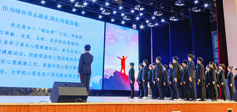 紧接着,2023级软件工程技术专业黄佳豪同学领誓,全体与会学生佩戴象征希望的绿色丝带进行“关爱自我 向阳生长”宣誓,承诺:从今天起,热爱生活,珍爱生命。一帆风顺时,值得感恩。经历挫折时,绝不放弃。要以饱满的热情,快乐成长!