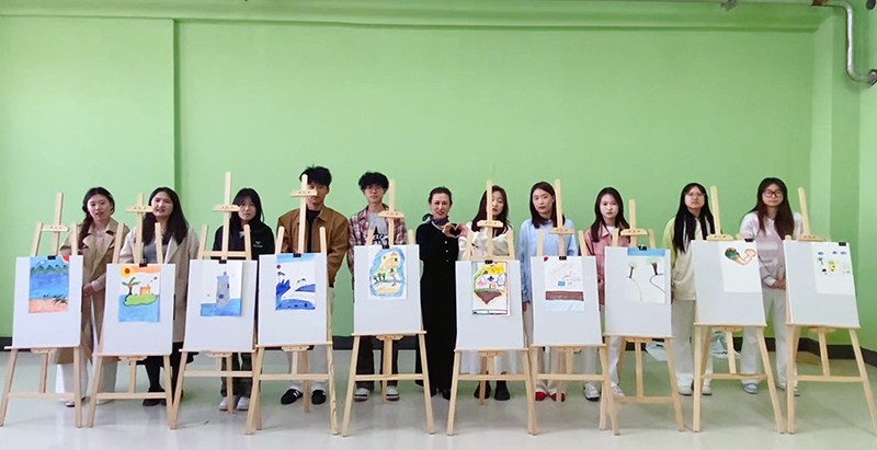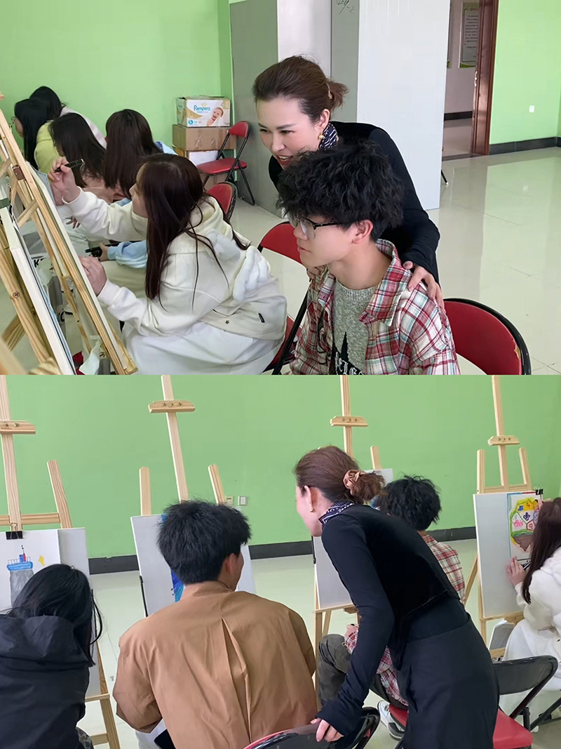 在关键的彩绘创作环节,黎婧巧妙引导同学们以“树”为主题进行创作,充分发挥奇思妙想,用手中画笔在画板上精心勾勒出形态各异的场景,每一棵被画下的树,都承载着同学们独一无二的内心世界与情感表达。
