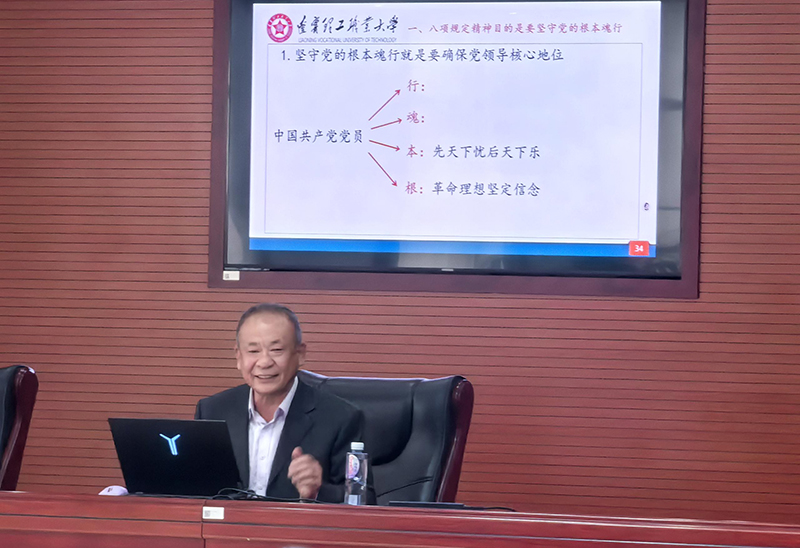 活动现场,马克思主义学院张觉力教授为与会人员带来了一场主题为《抓“关键少数”带全员多数,确保党的先进性纯洁性》的专题讲座,张教授以深厚的理论功底,从中央八项规定精神的目的是要坚守党的根本魂魄、中央八项规定精神产生的基本过程和主要内容、学习贯彻落实中央八项规定精神的重大历史意义三个维度对中央八项规定精神进行了全面且深入的解读。在讲解时,他从历史发展的长河中引用众多生动案例,如“徙木立信”彰显的言出必行、取信于民理念,“象牙筷定律”揭示由俭入奢易、由奢入俭难的深刻道理,深入浅出地阐释了中央八项规定精神对于党风政风乃至整个社会风气转变的深远影响。