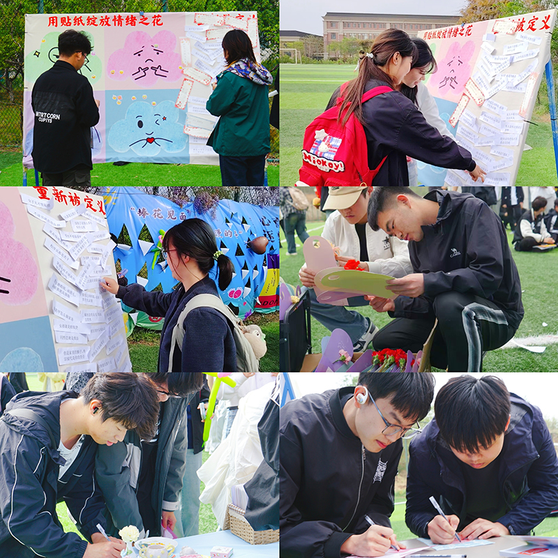 活动伊始,“情绪种籽”主题心理活动以趣味互动开启心灵探索。在“情绪碎片”区,色彩斑斓的“心灵地图”前,同学们用表情贴纸标记情绪状态,在胡淼老师的引导下探寻情绪根源。2024级李同学分享:“贴上‘焦虑’贴纸后,学到的呼吸调节法让情绪管理变得简单直观。”“撕掉被定义的标签”展区内,师生们撕下“社恐”“拖延症”等刻板标签,贴上“勇敢”“独一无二”等积极词汇,完成自我重塑。“故事换花”环节中,匿名心事卡片与康乃馨、弗朗花互换,花瓣形纸笺搭建的“解压花园”传递着温暖与治愈。