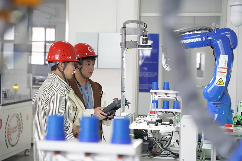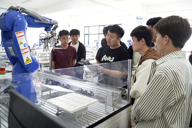 当文学遇见科技,当理论连接实践,一场职业新体验在悄然展开。活动以毕炜晗和刘炳辰两名同学朗诵的《智芯跃动文脉永传》拉开序幕。在智能制造学院一楼实训车间,安佳宝演示了ABB机器人,同学们亲眼见证了机械臂的精准动作,感受着科技与创新的融合魅力。在三楼工业机器人操作与编程实训室,同学们两人一组,化作机械操作手,亲手操控机械臂,感受代码与机械的完美契合,在他们认真的操作下,机械臂如同灵巧的手臂般舞动,精准执行每一个指令。