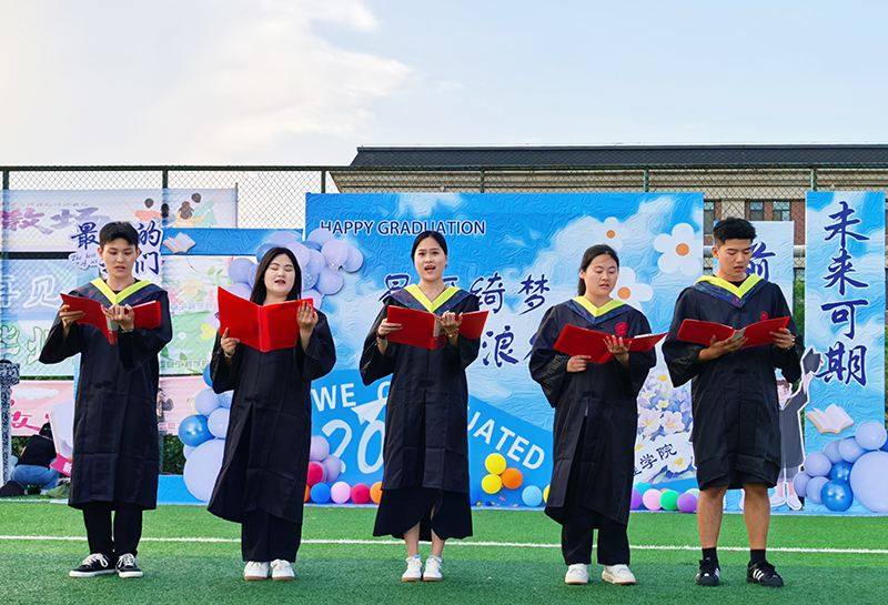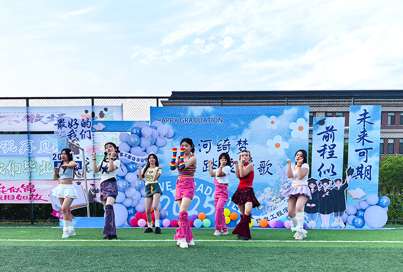 露天舞台打破边界,“第一次在足球场看晚会,感觉特别自由,和同学们席地而坐就像一场青春露营!”毕业生吕萌萌兴奋地说:“草坪上的青春叙事,共鸣了四年时光。”晚会节目以“时光列车”为脉络徐徐展开。一支优雅的现代舞《新章韵律》在草坪中央翩然起舞,舞者们用肢体语言诠释着成长的节奏,引领观众沉浸在时光流转的意境中。当毕业生代表对唱《我的好兄弟》时,熟悉的旋律勾起无数回忆,台下同学情不自禁跟唱,歌声中满是对同窗情谊的珍重。当曲目《凤凰花开的路口》响起时,不少人自发打开手机闪光灯,点点星光在绿茵场上汇成璀璨星河。星空下的温情告别,共赴未来之约。