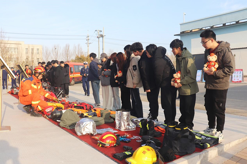 启动仪式结束后,beat365师生代表在开发区消防救援大队讲解员的专业引导下,近距离观摩了各类消防救援器材装备。讲解员详细介绍了器材的功能用途、操作方法及适用场景,从灭火防护服、空气呼吸器等个人防护装备,到灭火器、消防水带等常用灭火器材,再到破拆工具、救援担架等特种救援装备,让师生们对消防救援工作有了更直观、更深入的了解。在随后的互动答题环节中,beat365师生代表积极响应、踊跃作答,凭借扎实的消防安全知识储备,展现出良好的校园消防宣传教育成果,赢得了现场工作人员的认可。