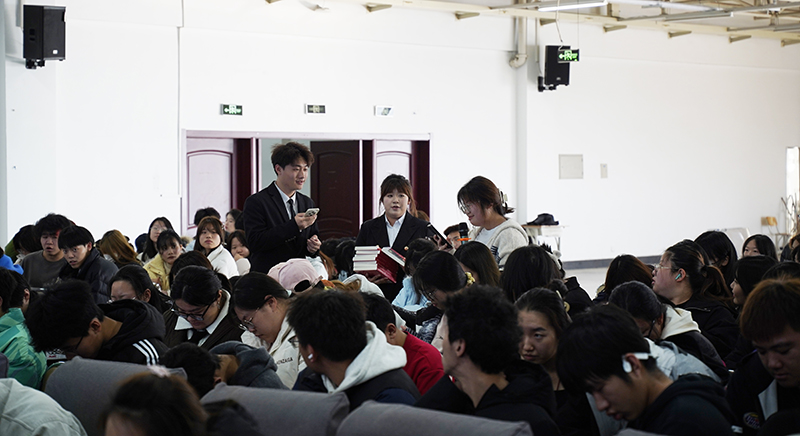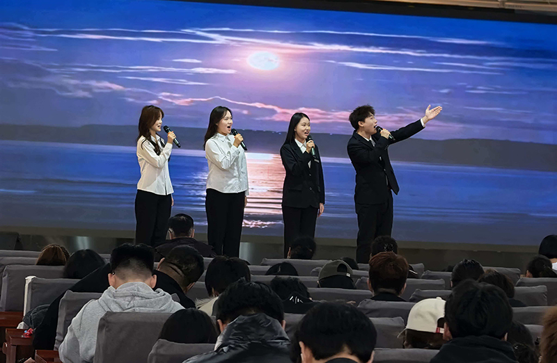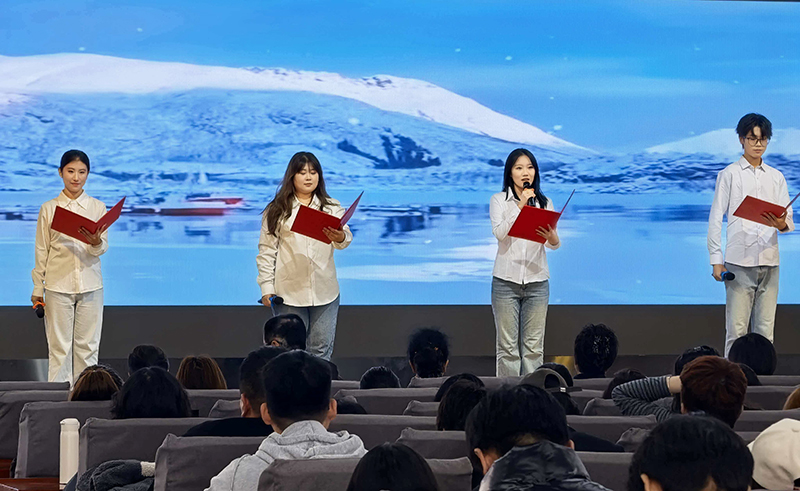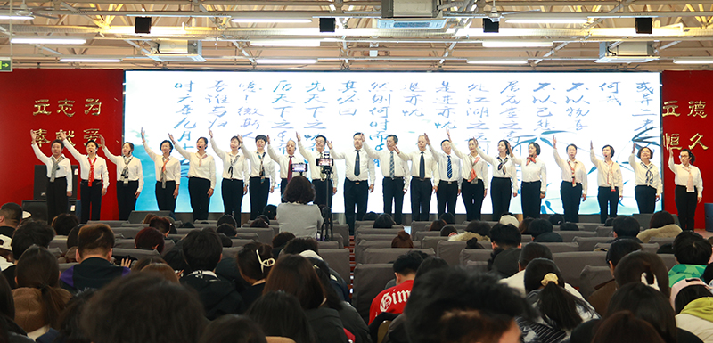 互动环节中,学生处向现场同学赠送《习近平与大学生朋友们》一书,鼓励同学们在阅读中坚定理想信念、汲取成长力量,进一步激发了大家的读书热情。活动尾声,锦州市语言艺术学会20位老师齐声朗诵《岳阳楼记》,“先天下之忧而忧,后天下之乐而乐”的千古名句响彻全场,将整场朗读会推向高潮,也为活动画上圆满句号。