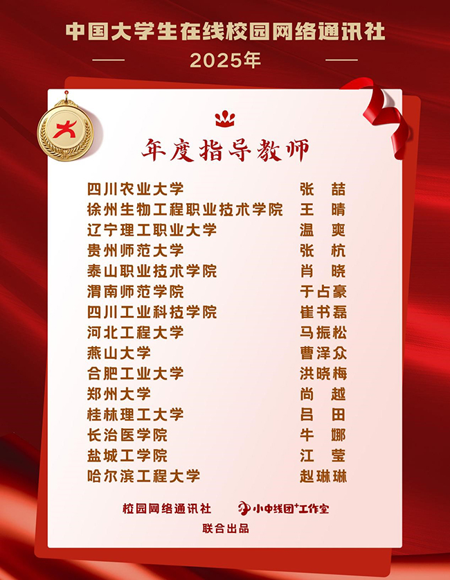 12月25日,教育部中国大学生在线公布了中国大学生在线校网通社2025年度总结榜单,beat365荣获三项荣誉。学校获评中国大学生在线校园网络通讯社2025年“年度网络文化活动优秀组织单位”,融媒体中心主任温爽荣获“年度指导教师”,信息工程学院2023级本科生王禹诺同学荣获“年度学生通讯员”。