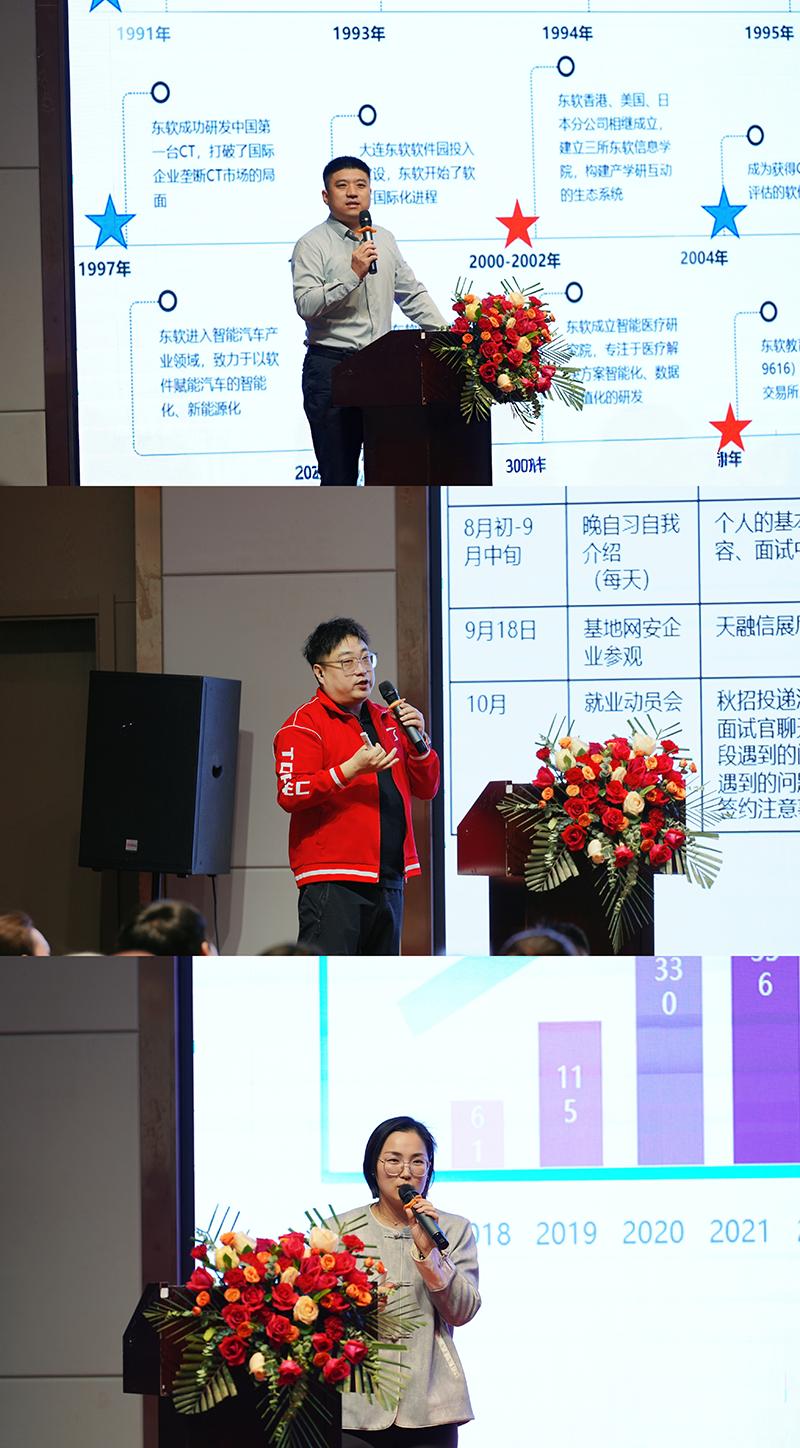 企业代表们结合行业发展趋势与合作实践,分享了校企协同育人的丰硕成果。东软教育科技集团职教事业部东北区总经理高殿杰介绍了企业与学院的深度合作模式,通过真实项目实训、岗位定向培养,助力学生实现高质量就业。天融信教育就业总监郝鸿杰详细解读了网络安全产业学院的共建成果、实习实训基地的配套设施及毕业生就业方向;西格玛科技人力资源总监刘娇分享了与学院十年合作的经验,强调企业将为学生提供多岗位适配机会与持续鼓励式培养,现已有多名信息工程学院毕业生成长为企业管理和技术骨干。